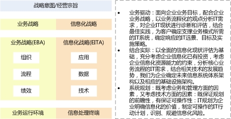 信息化规划咨询:根据企业的发展战略、业务流程和现有信息化水平,中科联通采用EA方法和SOA的思想,规划企业业务架构和IT架构:应用架构、数据架构、基础架构,以及IT治理架构、IT项目实施计划。